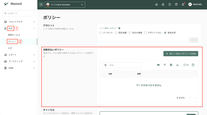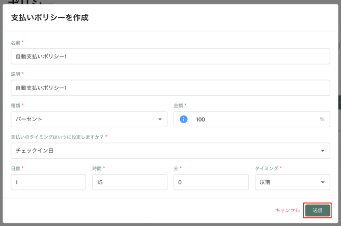 → 実際に「いつ請求を実行するか」を決めるルールです。キャンセルポリシーやデポジットポリシーとはシステム上つながっていません。