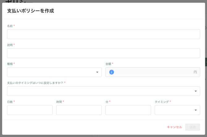 自動支払いポリシーを作成するウィンドウが表示されます。各フィールドの入力します。 💡項目名の横にアスタリスク(*)がついているものは入力必須項目です。