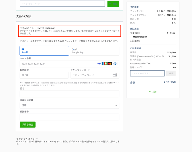 これにより、スタッフの業務負担を軽減し、支払いの透明性と一貫性を向上させます。ポリシーは予約時点で適用されます。