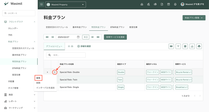 編集したい特別料金プランの行にある 「︙(3つのドットアイコン)」をクリック します。