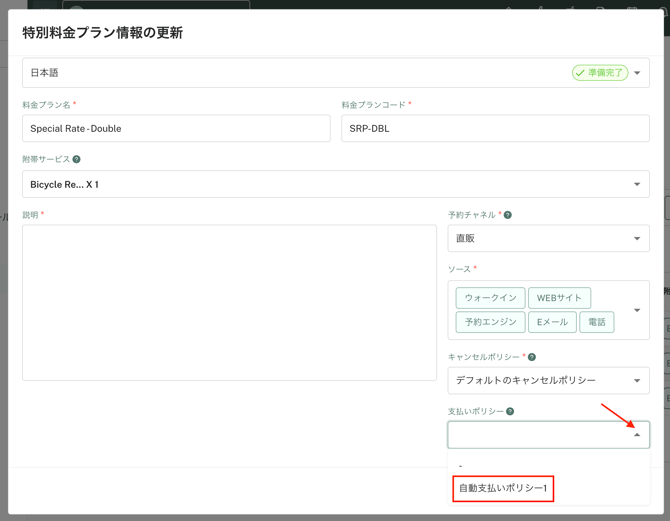 🦅自動支払いポリシーを活用することで、チェックインやチェックアウトのタイミングに応じた柔軟な支払い処理が可能になります。特別料金プランにポリシーを紐づけることで、予定されたデポジットや宿泊費を自動で請求でき、ゲストへの請求が効率化されます。