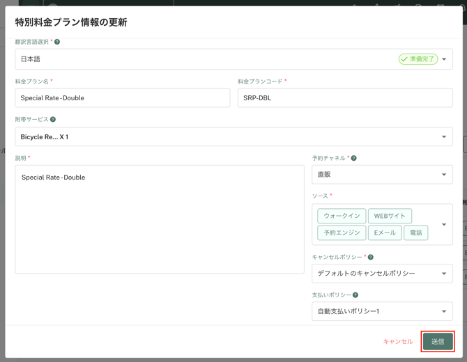 「送信」ボタンをクリックして設定を保存します。特別料金プランに自動支払いポリシーが適用されます。
